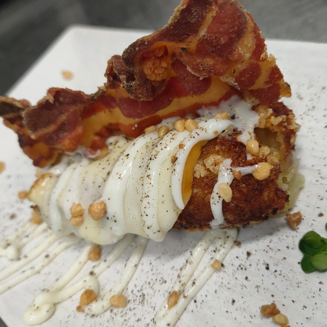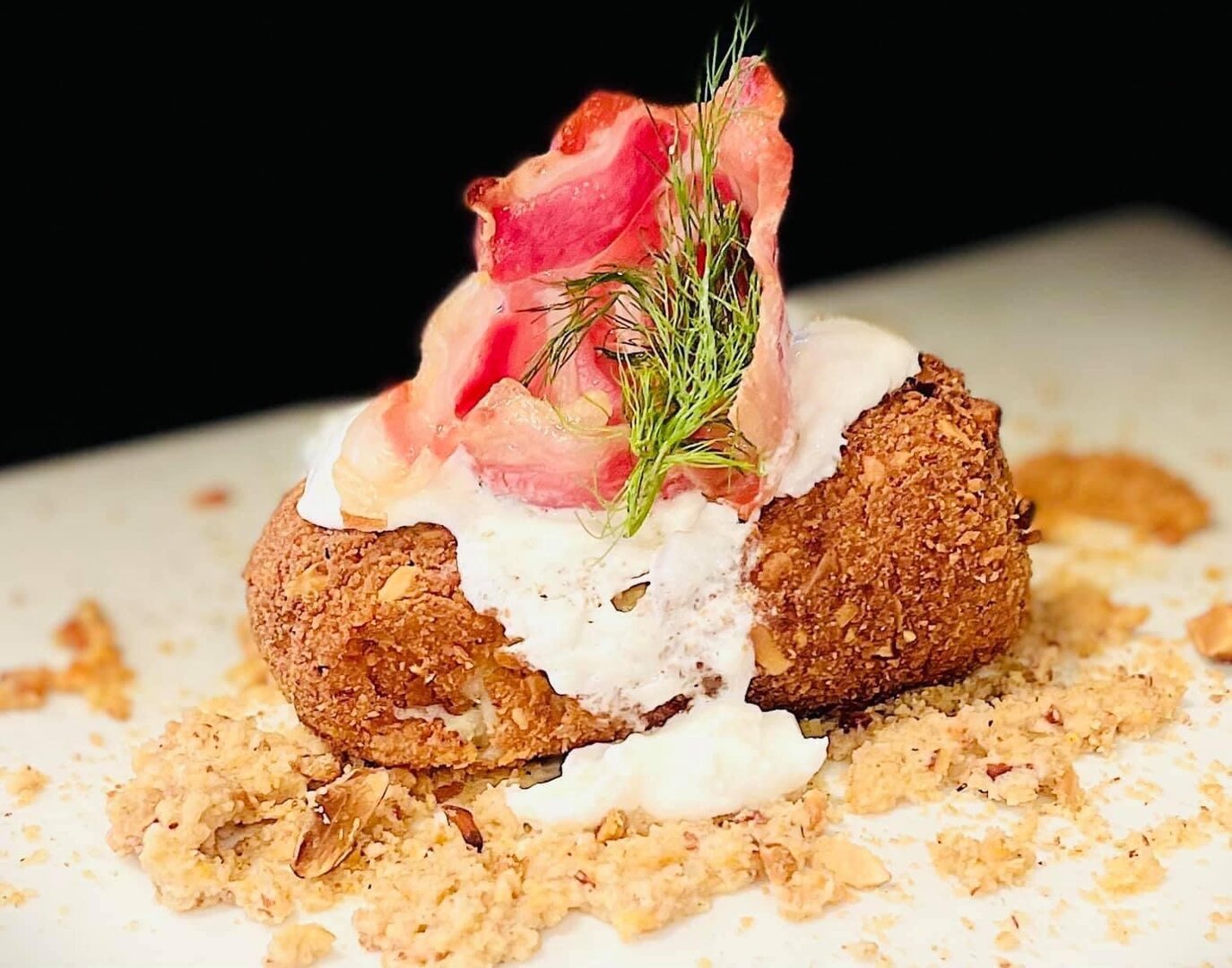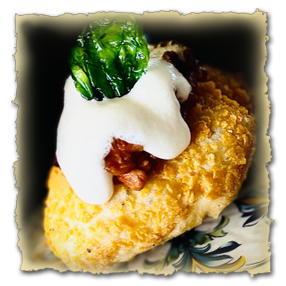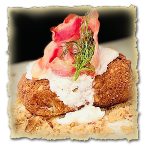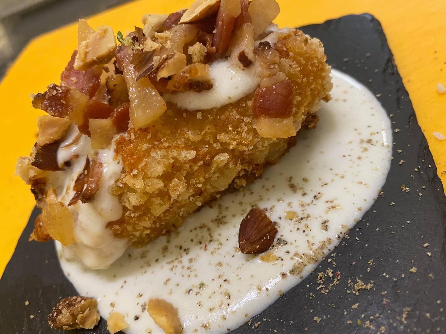 Patate, farina, uova, provola, salmone, lime, stracciatella pecorino romano, lime, pepe, pane grattugiato