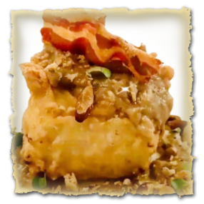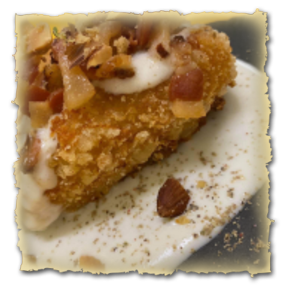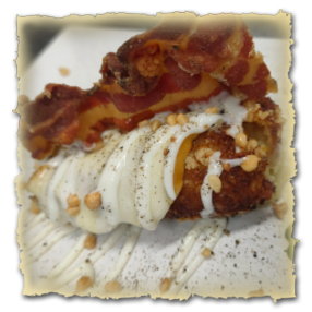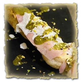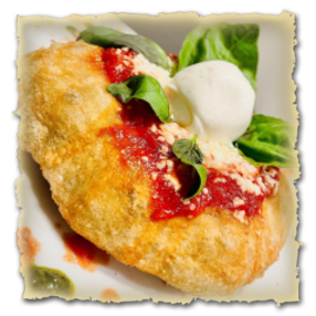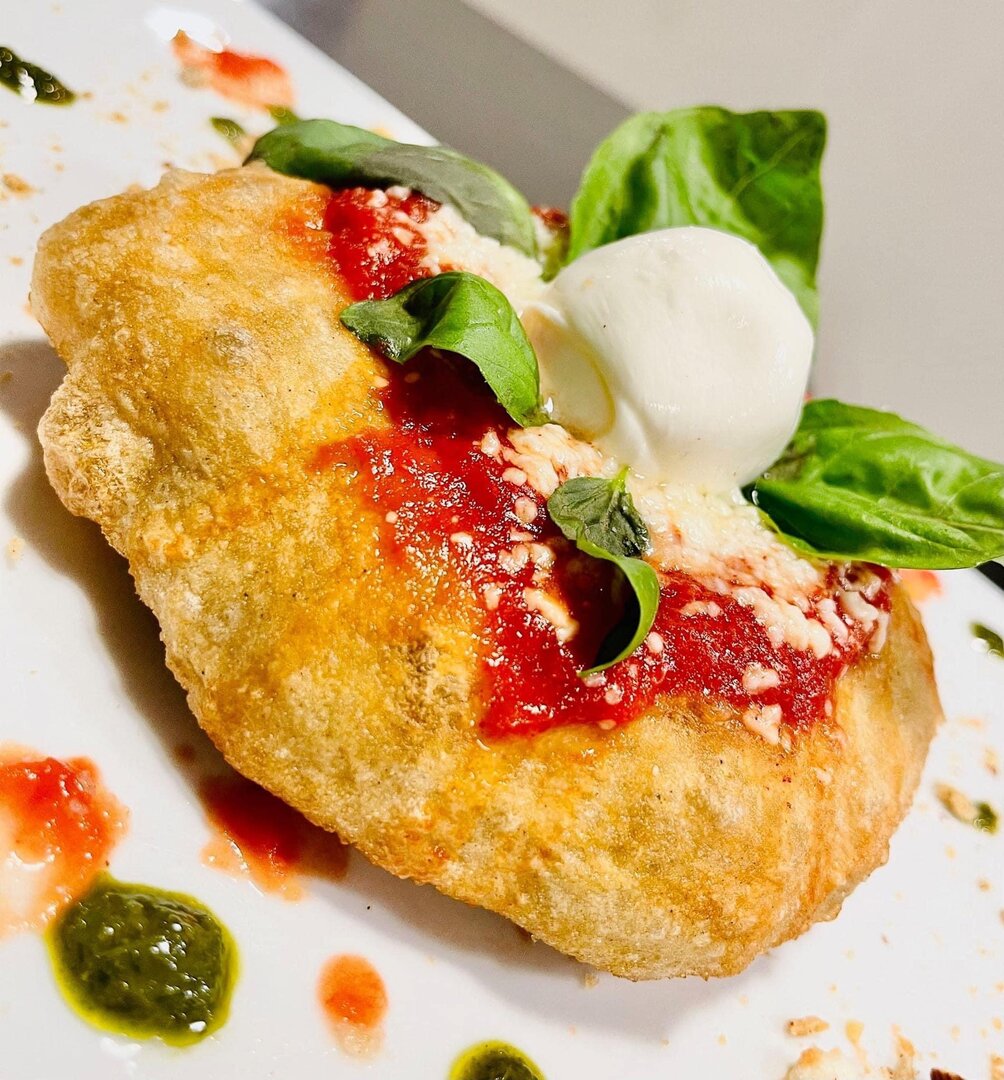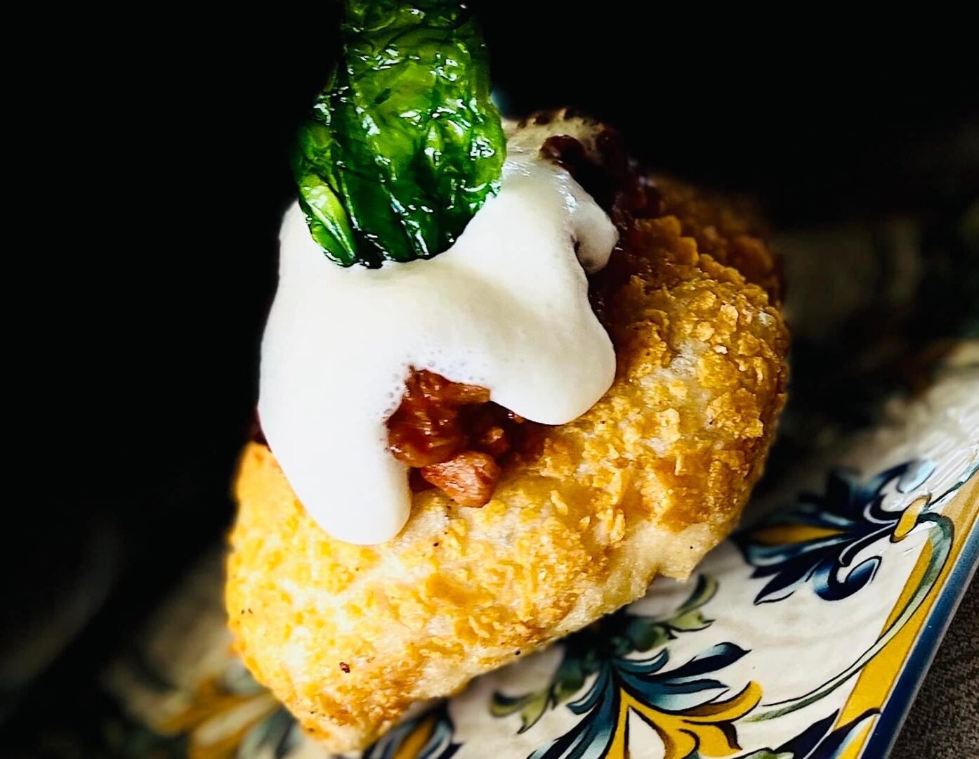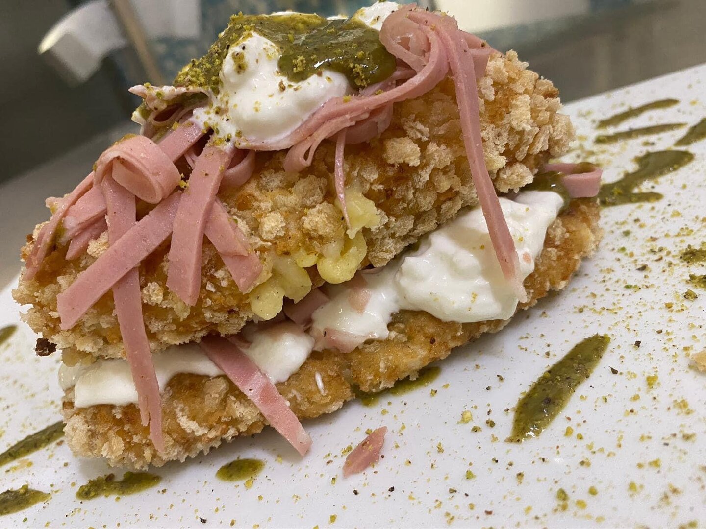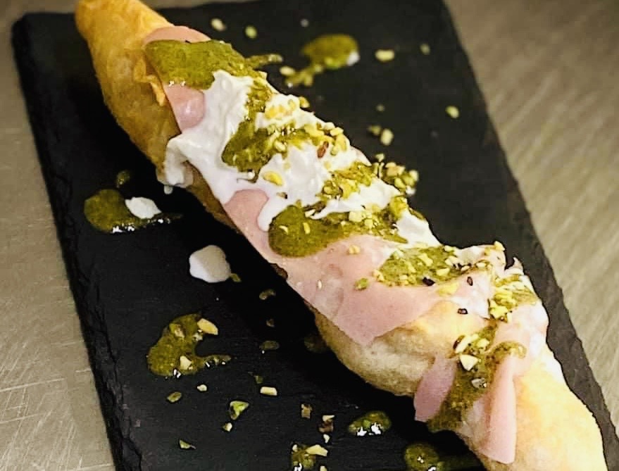 Fiore di zucca, provola, mortadella, stracciatella farina, granella di pistacchio
